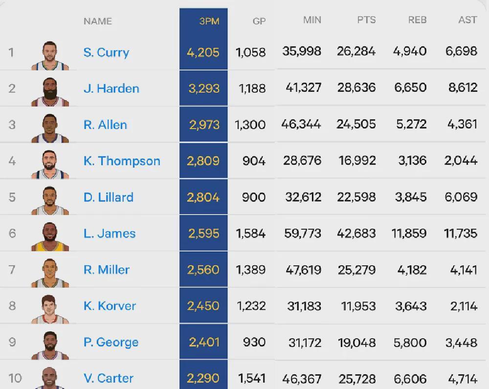 汤普森(2809)正式超越利拉德(2804),升至NBA史上三分球命中数榜单第4位。